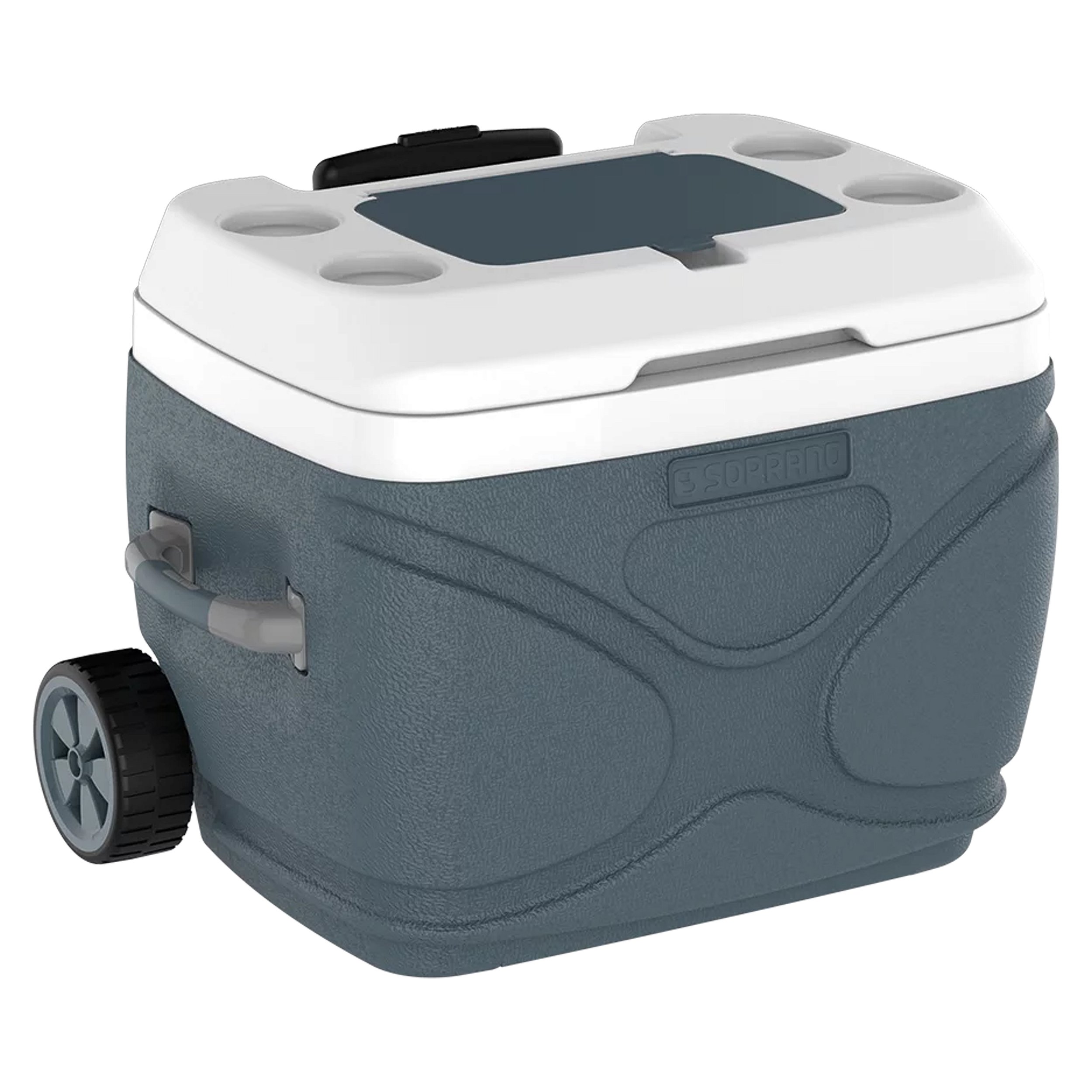 Equipada com rodas reforçadas e alça telescópica retrátil, facilita o transporte mesmo com o compartimento cheio. Conta ainda com alças laterais, dreno para escoamento da água derretida, e tampa articulada com porta-copos, garantindo praticidade e conforto no uso.
