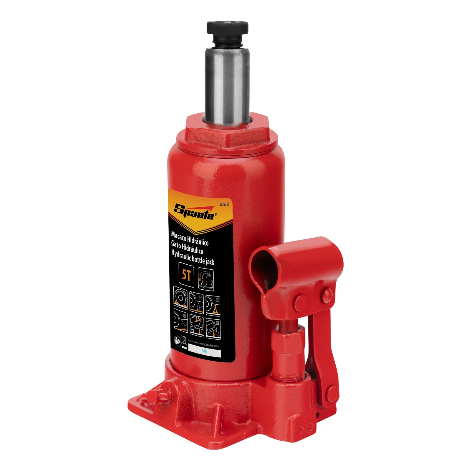 O macaco hidráulico de garrafa Sparta 5032355 é projetado para levantar cargas de até 5 toneladas a uma altura de 195 a 380 mm. É útil tanto para entusiastas de carros em garagens quanto para profissionais em oficinas mecânicas. O macaco garante uma elevação suave da carga sem esforço do usuário.